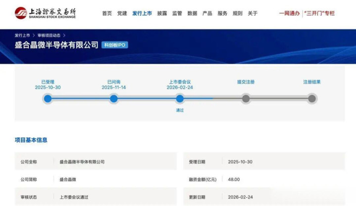 2025年10月30日,盛合晶微正式递交科创板IPO申请并获上交所受理;2月24日,马年新春后首个审核日,公司顺利通过科创板上市委审议,全程仅用117天。